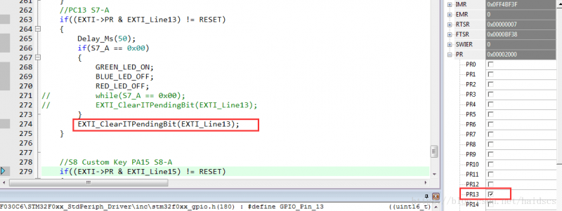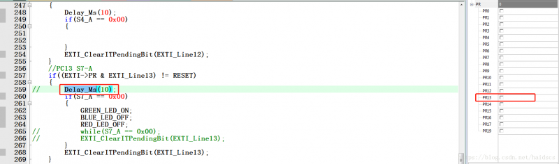 5、如果把延时函数去掉,debug界面看到中断触发请求寄存器PR13一直是0,其实中断还是一直响应,设置一个断点便知道;