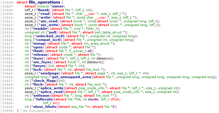 在linux内核源码的 include/linux 下的 fs.h 文件中,指定了一个文件操作集的结构体,里面包含驱动可以使用的系统调用函数。