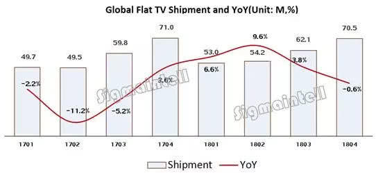 近期,根据群智咨询数据显示,2018年全球彩电出货总量达2.398亿台,相较2017年增长4.3%。从下图可以看到因2018年有诸如冬奥会、世界杯在内的大型国际体育赛事,使得2018年上半年总体增长较快,而到下半年则出现了回落甚至下滑。
