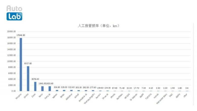 人工接管次数即为自动驾驶下,汽车遇到无法解决判断的问题时,需要人类驾驶员接管的次数,理论上讲,自动驾驶技术越成熟,接管次数越少,2018年的接管频次如下图所示。