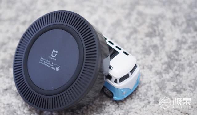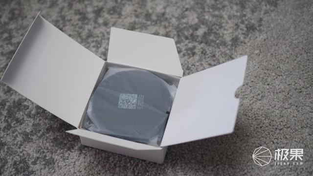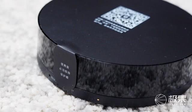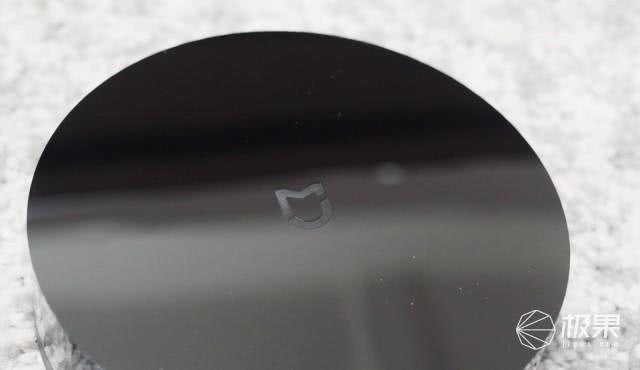 揭去保护膜,盒子采用亮黑色材质外壳,正上方中间位置是一个招牌式的米家 Logo