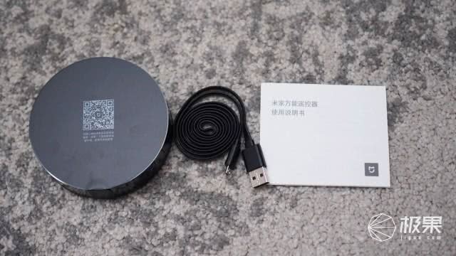 万能遥控的包装就更简洁了。惯例全家福:主机、电源线、说明书(没有电源适配器)