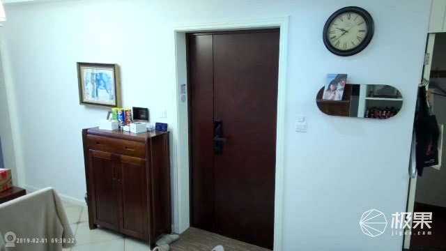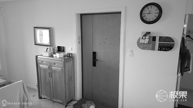 楼主摆放摄像头的位置为入户门左前方酒柜最高层,因此上文画面中拍摄角度为俯视视角。