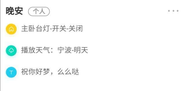 比如楼主的这条指令:当楼主唤醒小爱,并且说出“晚安”,小爱同学将执行上述三条指令