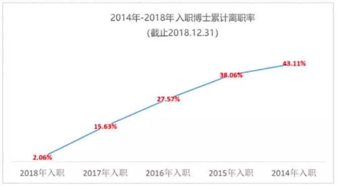 数据分析显示公司博士类员工近5年累计平均离职率为21.8%,入职时间越长累计离职率越高,2014年入职的博士经过4年,只有57%留在公司(如下图表所示)。