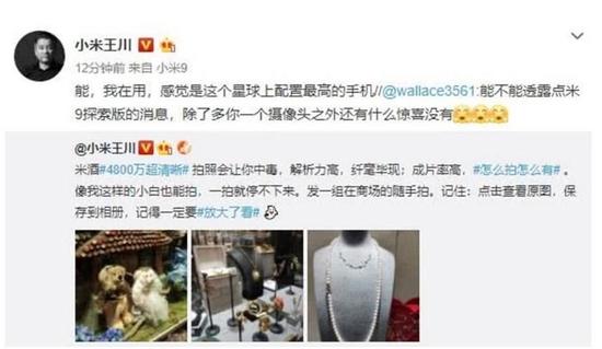 首先是小米集团联合创始人、中国区总裁、集团参谋长王川在回应网友问题时,暗示小米9的无线充电功率将大于15W。另外他还确认,小米9确实有探索版,并且称其是“地球上配置最高的手机”。