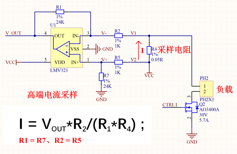 这个电路要检测电流最终的目的就是要得到图上VOUT和V1、V2的关系。