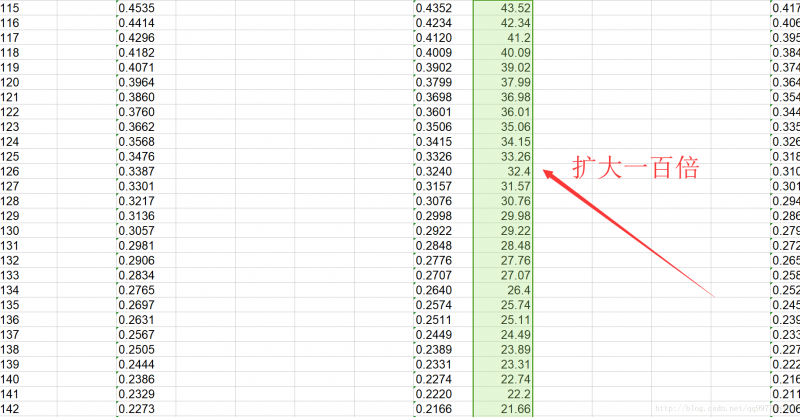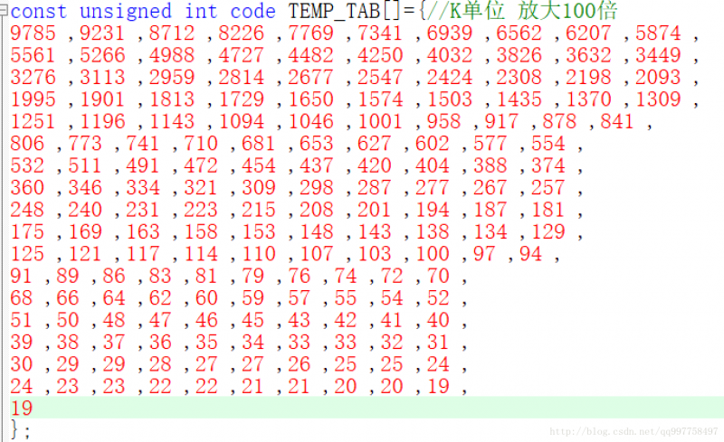 在表格中典型值后面的一列我把数据扩大100倍,并且把小数点去掉,目的是让数据成为整形,也同时提高精度。MCU中存储浮点数消耗的内存空间很大,并且在后期查找数值表的过程中整形的数据查找效率是要高上很多的。(如果不理解可以恶补一下相关知识)。把需要的数据扩大后复制到一个新建的txt中,这样做的目的是为了去除EXCEL中的格式问题,复制到txt就没有格式了,如果直接把这些数据在EXCEL中赋值是带格式赋值的,也就是赋值的不是数据,而是一堆格式。