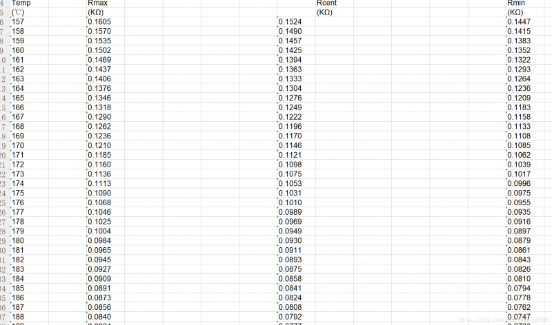 很多情况下在电子开发的过程中需要用到非线性表,根据厂家提供的表格用MCU测量ADC数值进行转换得到传感器的测量值,在此记录一下目前一个实用的方法,以下以温度探头传感器的非线性表为例: