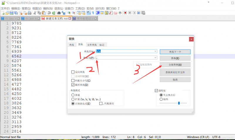 操作的方式是Ctrl+H(替换),根据图示的参数来替换(也就是把换行符("\r\n")替换成","),要注意一点是输入法一定要是英文输入法,这样才不会带代码中报错。