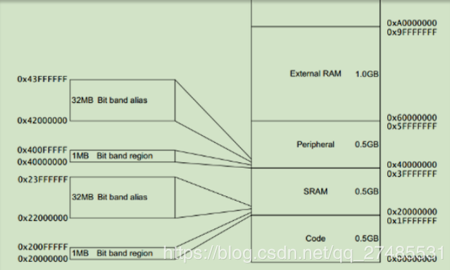 由上图可以看出STM32 支持位带操作的两个内存区的范围是: