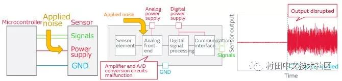模拟前端包含增幅电路和A/D转换电路,当这些电路的电源变动没有正常工作时,会输出异常值从而发生误操作。 实际为加速度传感器的电源线加入噪声做评估,确认输出会出现紊乱。 以上这样,One chip传感器的信号线或电源线施加噪声时,会发生通信停止或输出值紊乱的误操作。