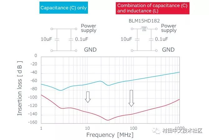 电源线的静噪对策适合从低频到高频的宽幅带宽下插入损耗较大的滤波器。 仅使用电容器的情况下,需要低频端的大容量电容器和为获得高频端插入损耗的低ESL电容器。 使用电容器和电感器组合的情况下,可使插入损耗显著增加。传感器比电感器配置足够的容量,构成多段结构,可形成有效的静噪滤波器。