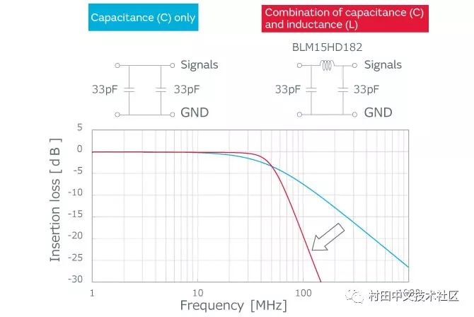 作为信号线(数据/时钟)的静噪对策,通过的信号频率需要插入损耗小的滤波器。 噪声级别小或信号和噪声的频率相差大的情况下,可以只用电容器进行降噪,但如果信号频率和噪声频率相近时,需要电感器和电容器组合来构成插入损耗陡峭的滤波器。