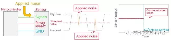 向数字信号线施加噪声时,噪声引起的超过高/低阈值而被误判断时,无法正常通信从而发生误操作。 实际为加速度传感器的数字信号线加入噪声做评估,确认通信会发生停止。