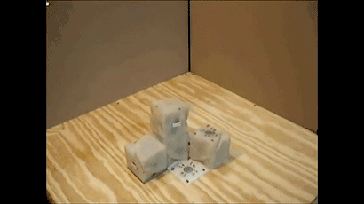 该团队做了一个简单的证明过程:使一个由多个小方块自由组合的机器人能够吸纳放在附近的新的方块,然后观察结果。机器人一开始只有3个方块,当机器人吸纳了3个方快,也就是一共有6个方块的时候,机器人把方块分成了2个3等份,相当于变成了两个具有3个方块的独立机器人。