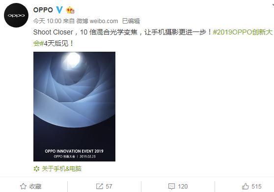 今天上午,OPPO官方宣布10 倍混合光学变焦将正式在2019OPPO创新大会上与消费者见面。