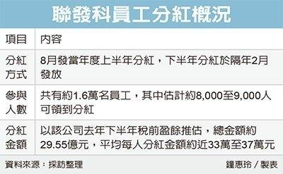 联发科公布去年下半年分红与今年度调薪计划,估计分红总金额近30亿元新台币(下同),以可参与分红员工约8,000至9,000人计算,平均每人可分得33万至37万元。