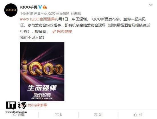 同时,iQOO手机还开启了粉丝招募,即有机会亲临发布会现场(提供星级酒店及报销往返行程)。