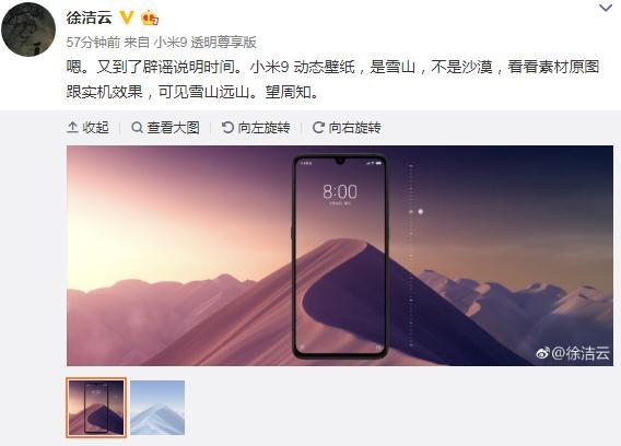 有传言称小米9动态壁纸是沙漠,徐洁云赶紧辟谣说:“小米9 动态壁纸,是雪山,不是沙漠,看看素材原图跟实机效果,可见雪山远山。望周知。”