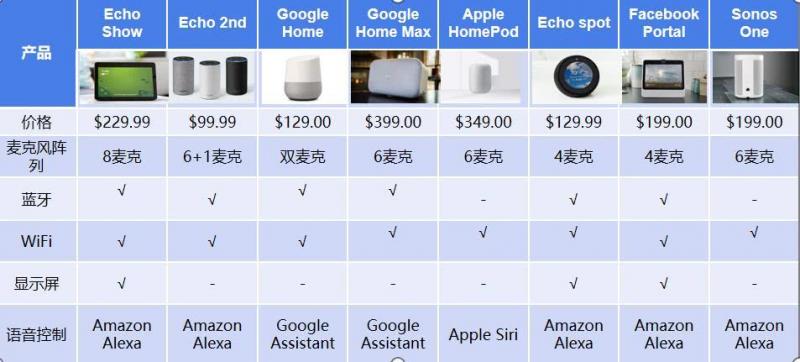 亚马逊最早推出的智能音箱Echo就是环形6+1麦克风阵列,而它推出的第二代Echo依旧延续了第一代麦克风的设计,2017年推出的Echo show 则多加了两个麦克,为8麦克阵列。从上述图表可以看出,智能音箱大多都采用6麦克风阵列,采用双麦克阵列的较少。