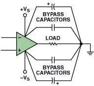 电源端到电源端:另外一种配置方法采用一个或多个旁路电容跨接在运算放大器的正电源端和负电源端之间。当在电路中配置四个电容器很困难的情况下通常采用这种方法。