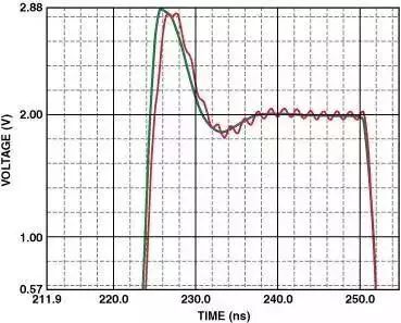 图7中的振荡示出了高速运算放大器同相输入端长度为2.54 cm的印制线的影响。其等效寄生电感为29 nH(10-9H),足以造成持续的低压振荡,会持续到整个瞬态响应周期。图7还示出了如何利用接地平面来减小寄生电感的影响。