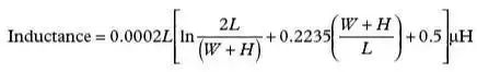 带状电感是另外一种需要考虑的寄生效应,它是由于印制线过长或缺乏接地平面引起的。式(2)示出了计算印制线电感(Inductance)的公式。参见图6。