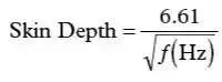 在高频段,必须考虑一种称为“趋肤效应”的现象。趋肤效应会引起电流流向导线的外表面——结果会使得导线的横截面变窄,因此使直流(DC)电阻增大。虽然趋肤效应超出了本文讨论的范围,这里还是给出铜线中趋肤深度(Skin Depth)的一个很好的近似公式(以cm为单位):