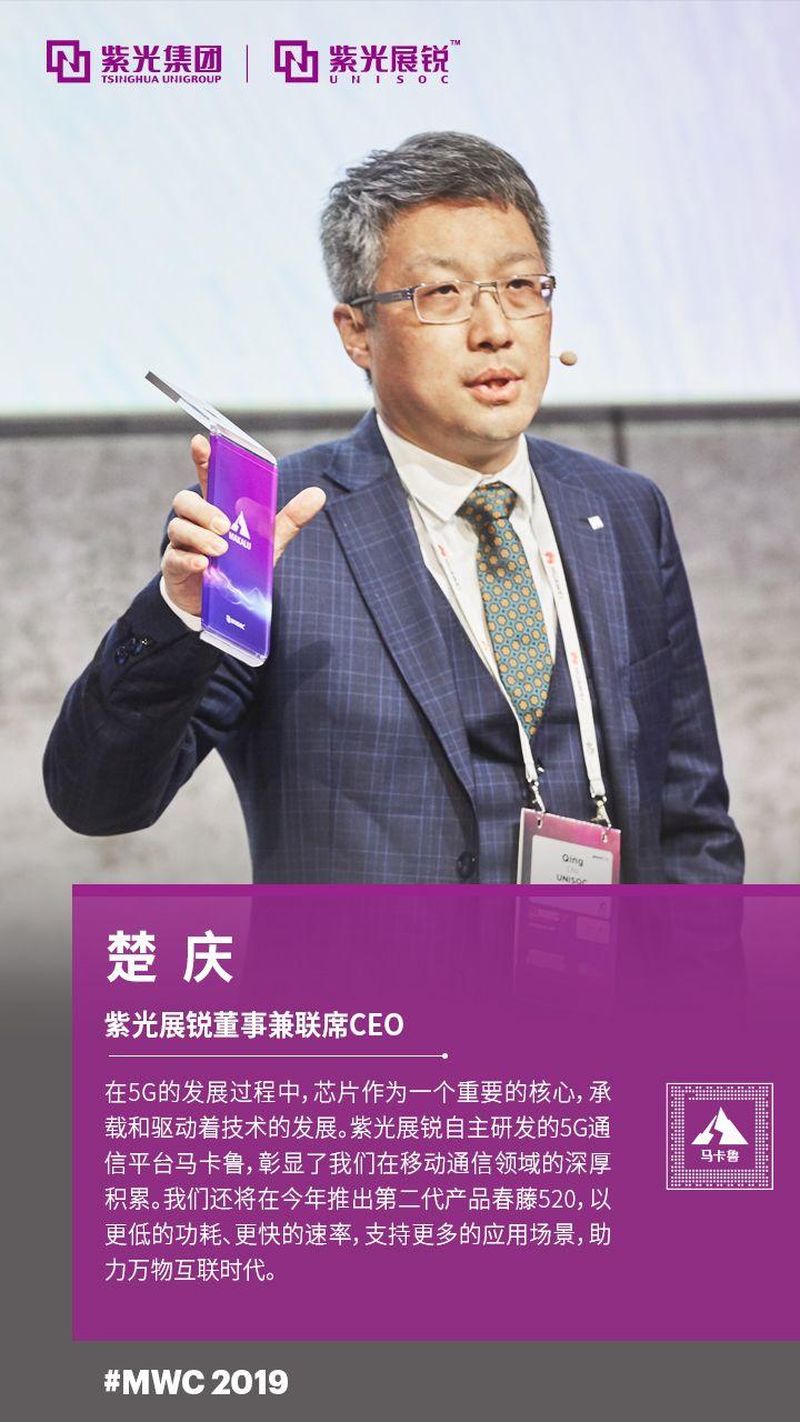 紫光展锐董事兼联席CEO楚庆在会上向全球合作伙伴展示了展锐自主研发的5G通信技术平台—马卡鲁及其首款5G基带芯片—春藤510。他在会上表示,在5G的发展过程中,芯片作为一个重要的核心,承载和驱动着技术的发展。紫光展锐自主研发的5G通信平台马卡鲁,彰显了我们在移动通信领域的深厚积累。我们还将在今年推出第二代产品春藤520,以更低的功耗、更快的速率,支持更多的应用场景,助力万物互联时代。
