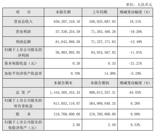报告期内,江丰电子实现营业收入65,020.73万元,较上年同期增长18.21%;营业利润5,753.83万元,较上年同期下降19.26%;利润总额为6,164.29万元,较上年同期下降13.49%;归属上市公司股东的净利润为5,698.40万元,较上年同期下降11.01%。报告期内,公司基本每股收益为0.26元,较上年同期下降21.21%;加权平均净资产收益率为9.70%,较上年同期下降5.28%。
