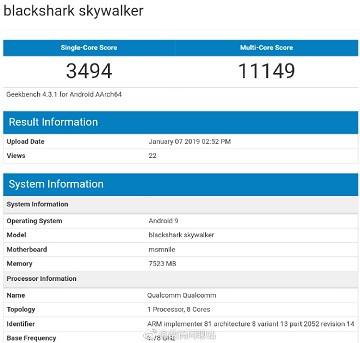 再早之前,曾有一款代号为黑鲨skywalker的新机跑分在网上曝光,跑分显示,这款黑鲨手机搭载搭载骁龙855芯片,内置8GB内存,预装Android 9系统,单核跑分3494,多核跑分11149。