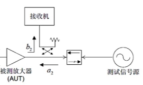 在图5中,被测放大器就是芯片的功率放大器,使其进入最大功率输出;而测试信号源则提供一个反向输入信号a2到放大器;放大器输出端所产生的反射信号b2 通过定向耦合器被接收机检测到;b2与a2之比即为放大器的大信号S22 参数。需要注意两点:第一,被测芯片和测试信号源之间需要加定向隔离器,防止大信号损坏信号源;第二,芯片输出频率和信号测试频率要异频。