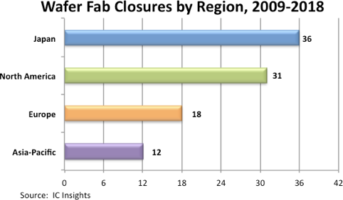 同期,北美关闭了31座晶圆厂,欧洲关闭了18座晶圆厂,整个亚太地区(除日本)关闭了12座。