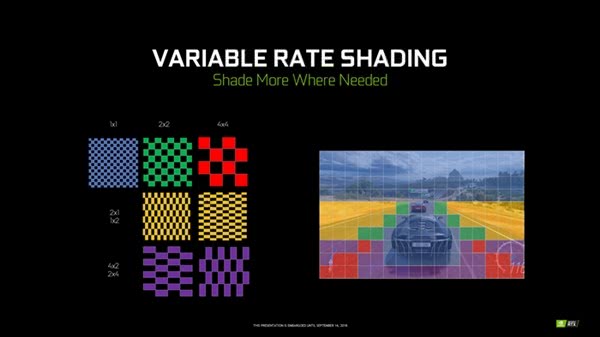 NV举过赛车游戏的例子做说明,主体赛车拥有最高密度的像素填充量,而道路、两侧风景的填充量则依次减少。据说GTX 1660 Ti显卡相比GTX 1060显卡在游戏帧数上提升50%,很大程度上就有VRS的功劳。