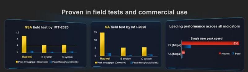 第三张图是客户5G商用网各厂家设备的对比情况,华为5G网络单用户速率达1.3G,远高于友商。