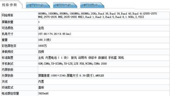 据悉,该机用上了6.39英寸的AMOLED屏幕,分辨率为1080X2340,机身尺寸为157.66×74.26×8.95(mm),重达188.3克,后置三颗摄像头,机身暂时只有金色可选。