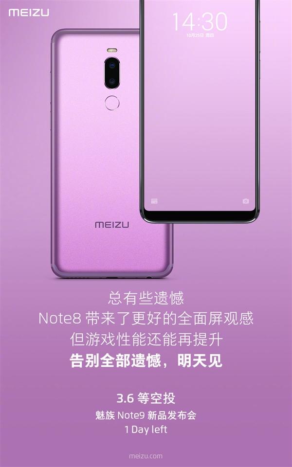 3月5日魅族公布了魅族Note 9最后一张海报,海报上写到:“Note 8带来了更好的全面屏观感,但游戏性能还能再提升,告别全部遗憾,明天见”。