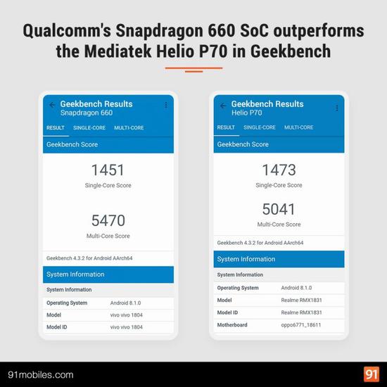 近日,外媒91mobiles就放出了骁龙660和联发科P70在Geekbench上的跑分对比,如下图所示,在单核心上,联发科P70略微优于骁龙660,但差距不大(前者1473,后者1451),在多核心上,骁龙660与联发科P70拉开了较大的差距,其中骁龙660为5470分,而联发科P70则为5041分。