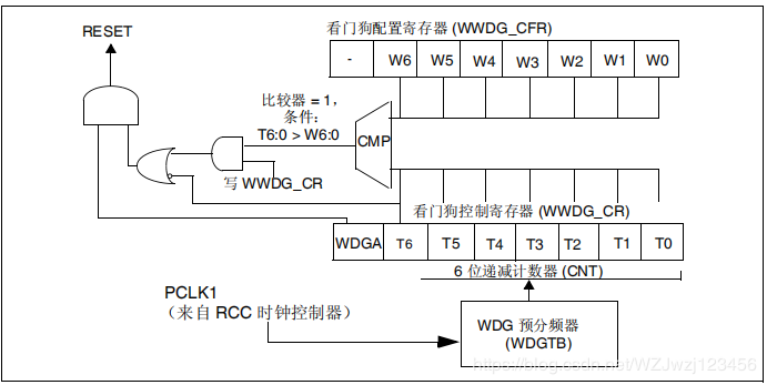 递减计数器处于自由运行状态:即使禁止看门狗,递减计数器仍继续递减计数。当使能看门狗时,必须将 T6 位置 1,以防止立即复位。T[5:0] 位包含了看门狗产生复位之前的计时数目;复位前的延时时间在一个最小值和一个最大 值之间变化,这是因为写入 WWDG_CR 寄存器时,预分频值是未知的。配 置寄存器 (WWDG_CFR) 包含窗口的上限:为防止发生复位