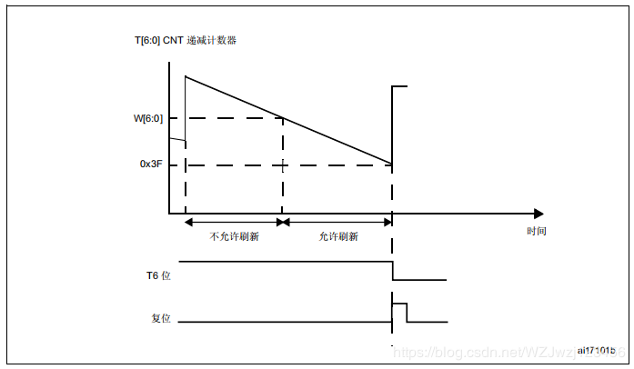如果激活看门狗(WWDG_CR 寄存器中的 WDGA 位置 1),则当 7 位递减计数器(T[6:0] 位)从 0x40 滚动到 0x3F(T6 已清零)时会引发复位。当计数器值大于窗口寄存器中所存 储的值时,如果软件重载计数器,则会产生复位。