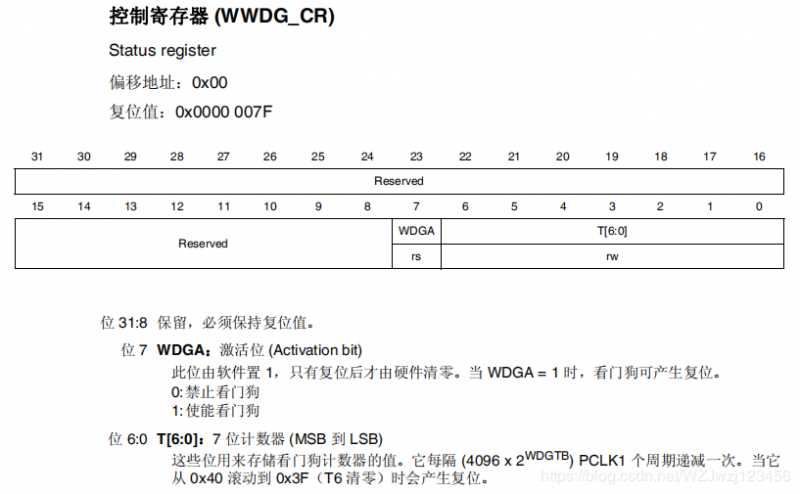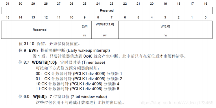 窗口看门狗的第二个寄存器是配置寄存器(WWDG_CFR),该寄存器的各位及其描述如下图所示