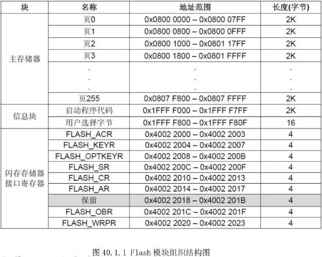 不同型号的 STM32,其 FLASH 容量也有所不同,最小的只有 16K 字节,最大的则达到了 1024K 字节。市面上 STM32F1 开发板使用的芯片是 STM32F103系列,其 FLASH 容量一般为 512K 字节,属于大容量芯片。大容量产品的 Flash 模块组织结构如图 40.1.1 所示: