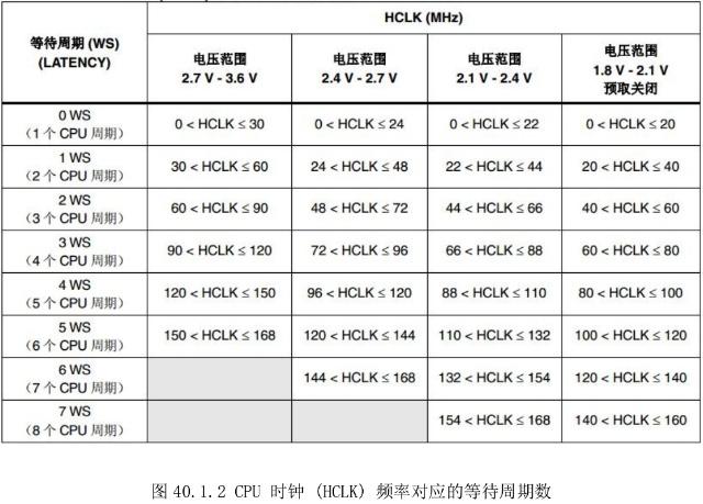 STM32F1 可通过内部的 I-Code 指令总线或 D-Code 数据总线访问内置闪存模块,本章我们主要讲解数据读写,即通过 D-Code 数据总线来访问内部闪存模块。为了准确读取 Flash 数据,必须根据 CPU 时钟 (HCLK) 频率和器件电源电压在 Flash 存取控制寄存器 (FLASH_ACR)中正确地设置等待周期数(LATENCY)。当电源电压低于 2.1V 时,必须关闭预取缓冲器。 Flash 等待周期与 CPU 时钟频率之间的对应关系,如图 40.1.2 所示: