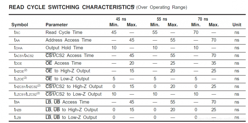 根据提取出来的要求:整个读周期大于55ns、地址建立时间55ns且读使能25ns才能确保输出数据