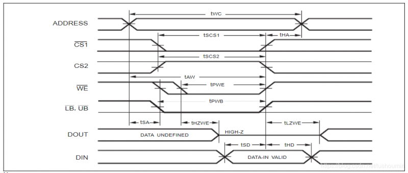 根据提取出来的要求:整个写周期大于55ns、写使能时间大于45ns(tHZWE+tSD)才能保证数据写入