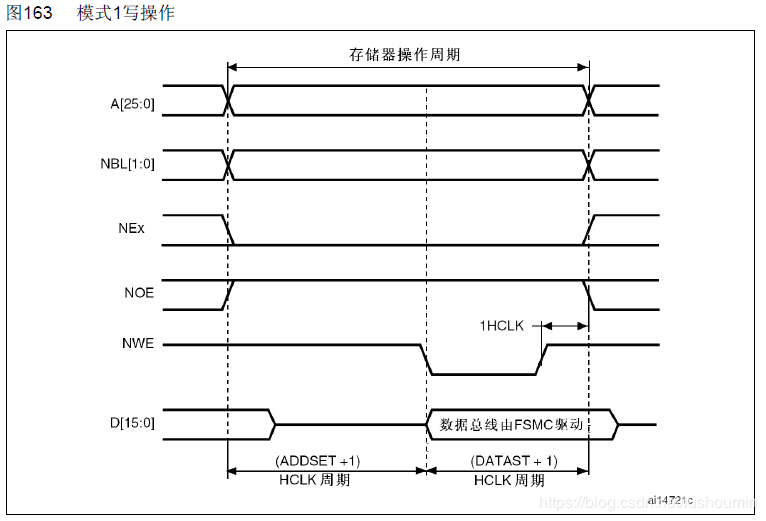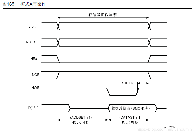 STM32F103的HCLK配置为72MHz,则tHCLK=13.8ns。因此,DATAST = 1且ADDSET >= 1,DATAST >= 2且ADDSET >= 0。