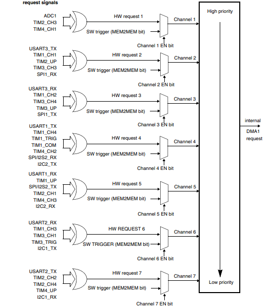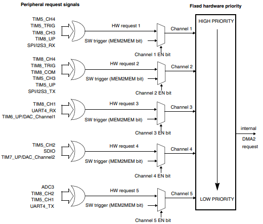 ● 每个通道都直接连接专用的硬件DMA请求,每个通道都同样支持软件触发。这些功能通过软件来配置。
