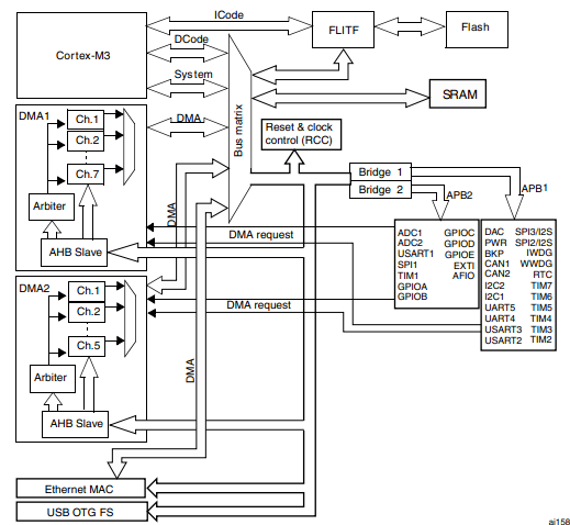 ● 闪存、SRAM 、外设的SRAM 、APB1 APB2和AHB外设均可作为访问的源和目标。