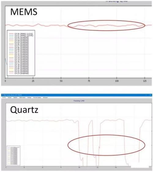 图1:MEMS与石英时钟器件在热气流和振动下的卫星跟踪对比,石英多次丢失信号,而MEMS表现非常稳定